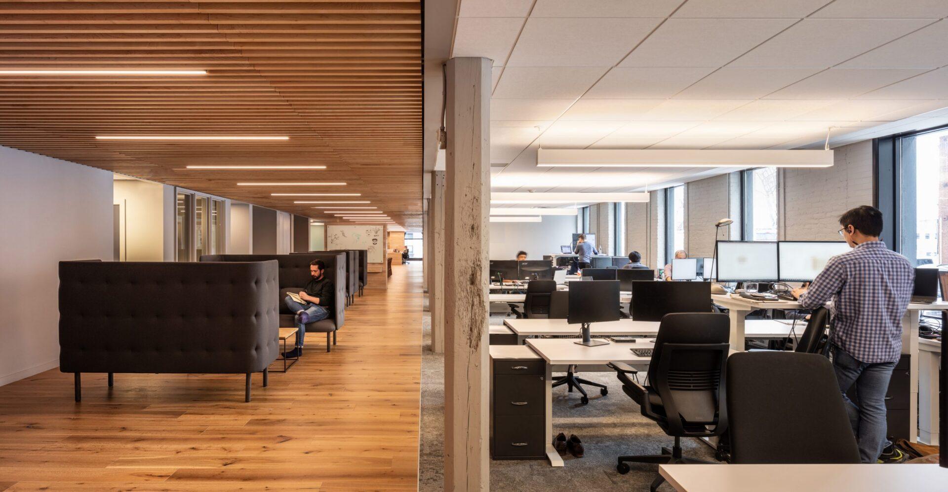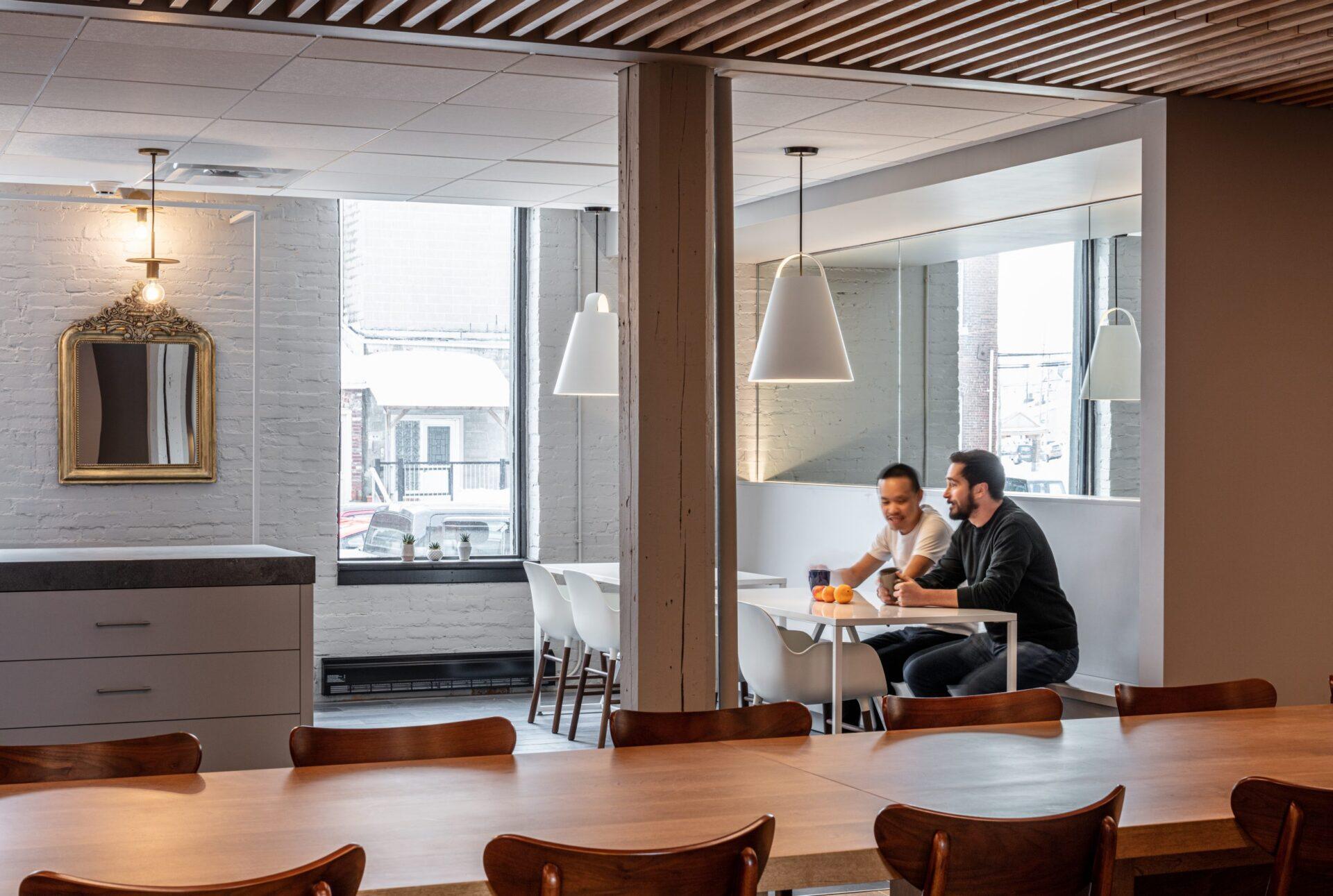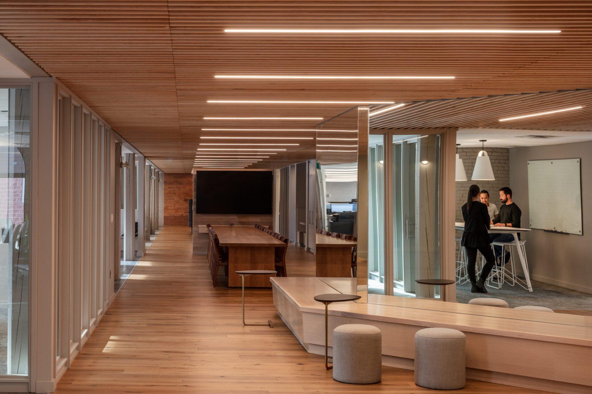 With the help of Acre, this modern engineering firm choose one of Fredericton’s most ironically historic structures for their new headquarters. Our mission was to help celebrate the textured original interior while making clear distinctions between new and old. We created a new wood ceiling to delineate collaborative zones and help define circulation routes within.